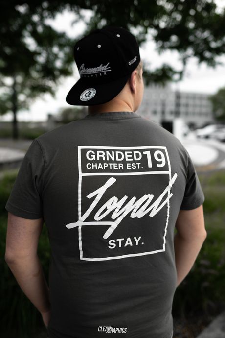 Die Rückseite ziert das Stay Loyal Logo über den Rücken als weißer Textildruck. Auf der Vorderseite findet unser Schriftzug seinen Platz.